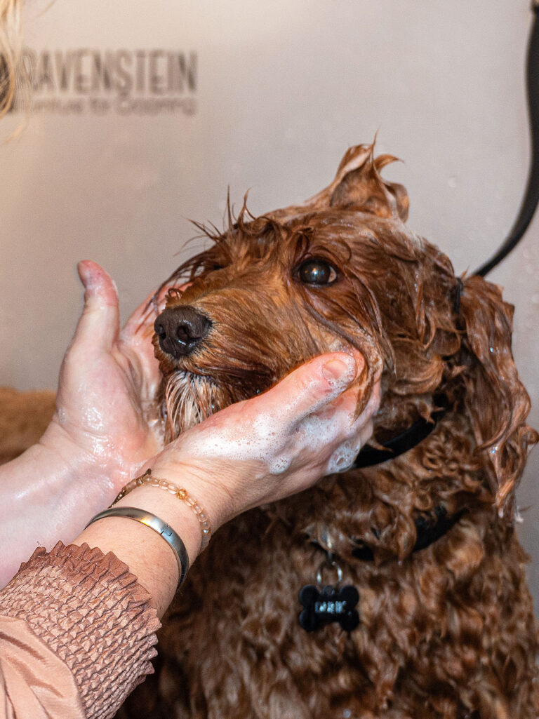 Ik maak je doodle eerst helemaal klitvrij. Daarna was ik hem met professionele shampoo en conditioner.
